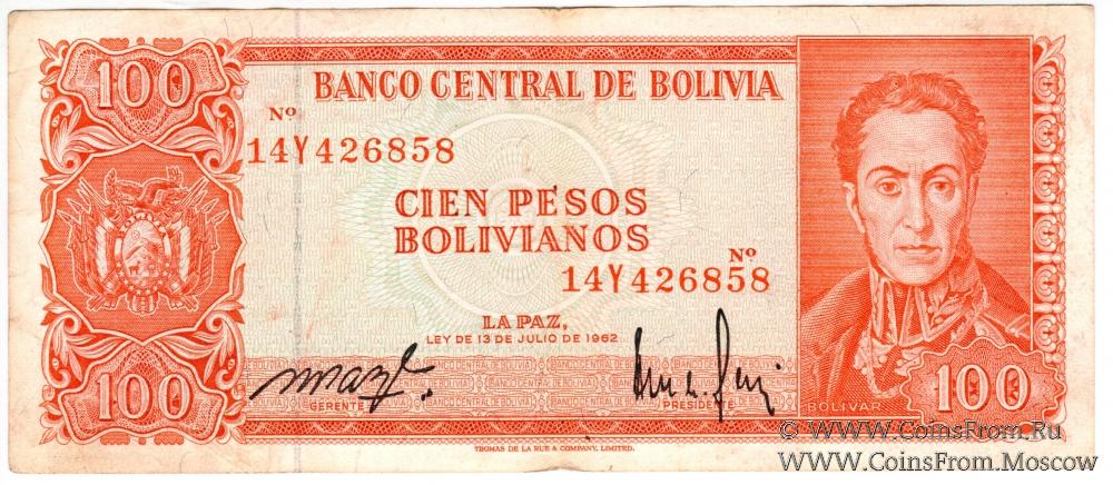 Выпуск 1962 г. Реверс темно-красный.  Центральный банк Боливии (BANCO CENTRAL DE BOLIVIA).