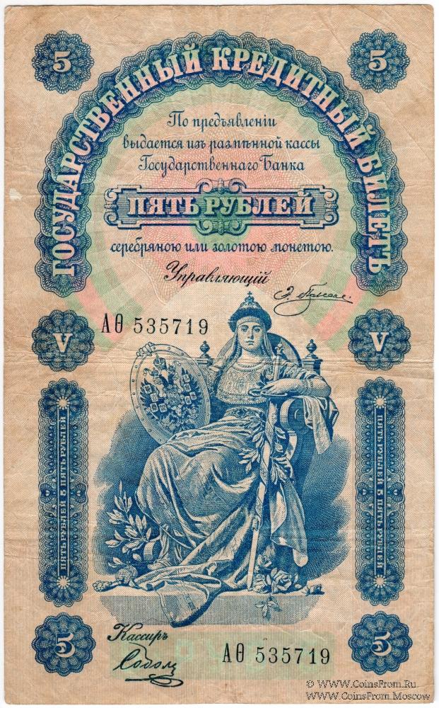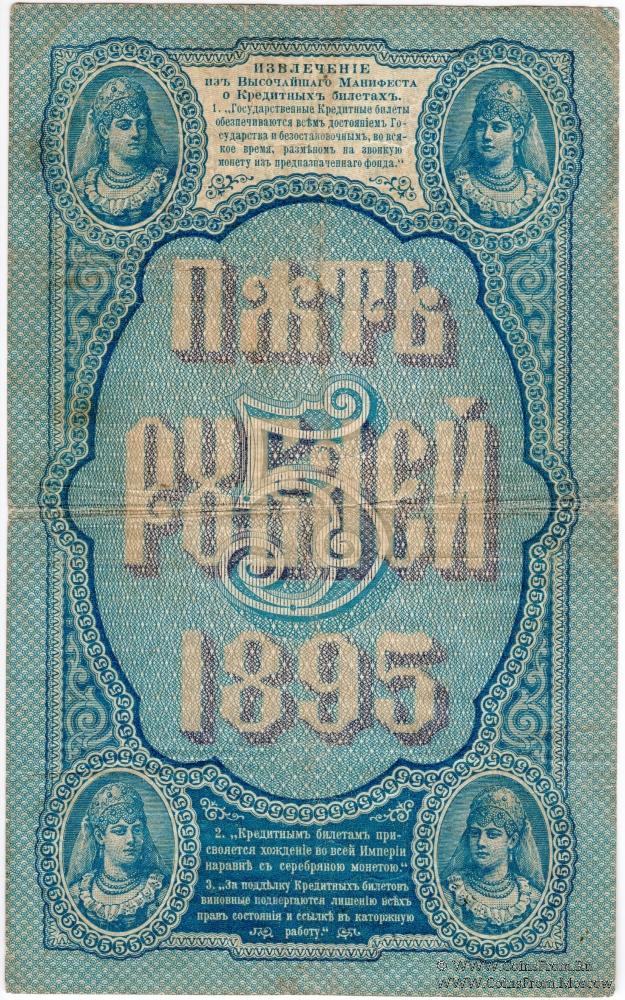 Государственный кредитный билет утвержден - 13 октября 1895 г. № 12070 "Описание Высочайше утвержденного образца государственного кредитного билета пятирублевого достоинства. "Выпущен в обращение 1 декабря 1896 г. Билеты оставались в обращении до 1922 г.