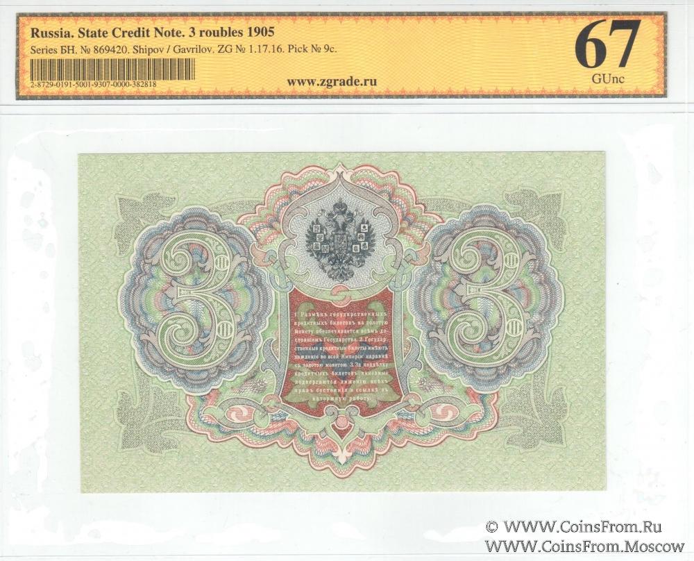 Государственный кредитный билет 3 рубля образца 1905 г. Управляющий - Шипов, кассир - Гаврилов.