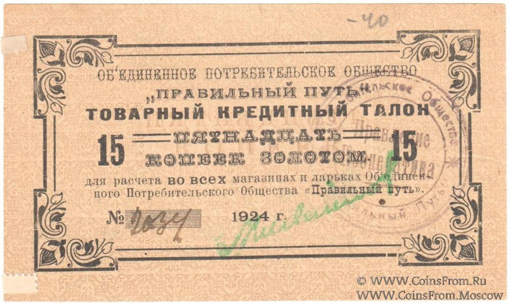 Товарный кредитный талон (золотом). Подпись зеленая. Объединенное потребительское общество "Правильный путь".