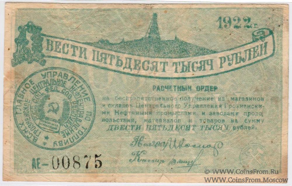 Расчетный ордер 1922 г. В.С.Н.Х. Главного управления по топливу. Грозненское центральное нефтяное управление. Грознефть.