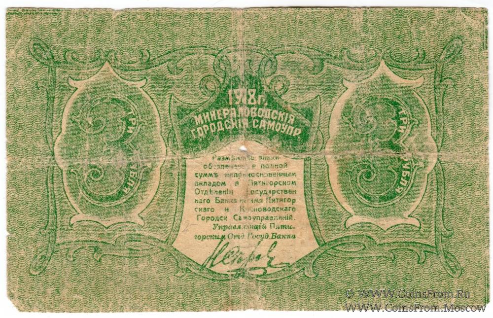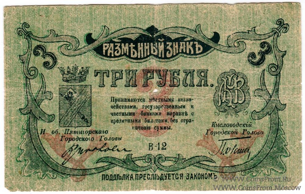 Разменный знак 3 выпуск 1918 г. Литера "В". Минеральные Воды. Минераловодское Городское Самоуправление.