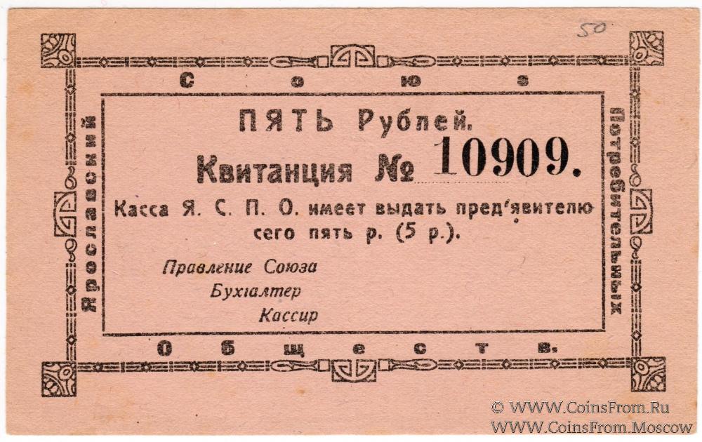 Квитанция без даты (1918 г.). Бланк без номера. Ярославский союз потребительских обществ (Я.С.П.О.).