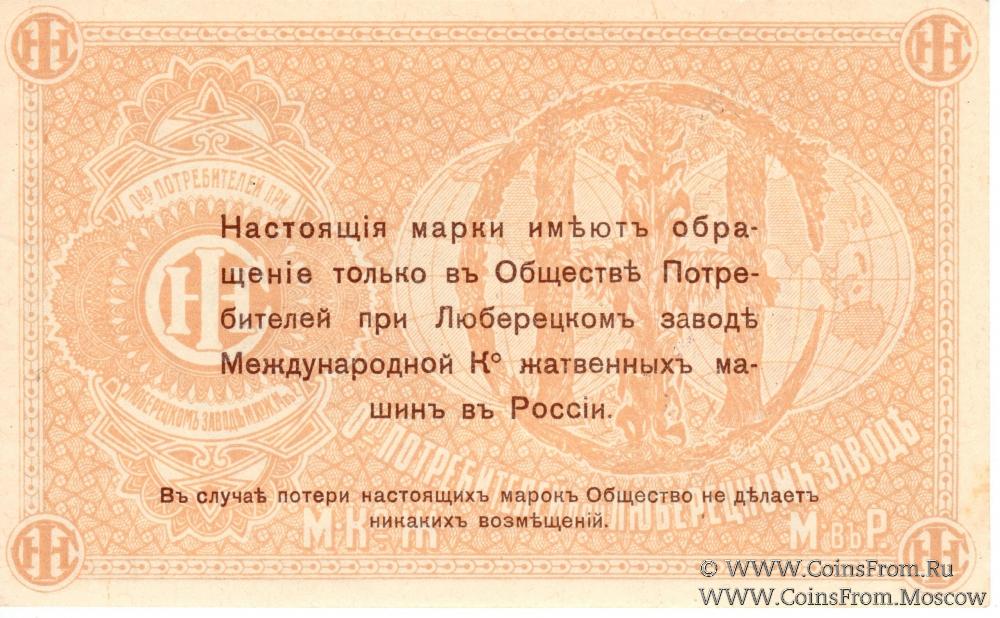 Люберцы. Московская губерния. Частные боны России. Общество потребителей при заводе Международной Ко жатвенных машин в России.
