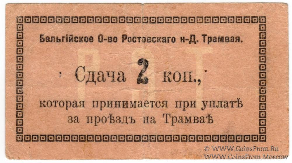 Цифра "2"- "волнистая". Печать на реверсе. Сдача, которая принимается при оплате за проезд на Трамвае. Бельгийское Общество Ростовского НД Трамвая.