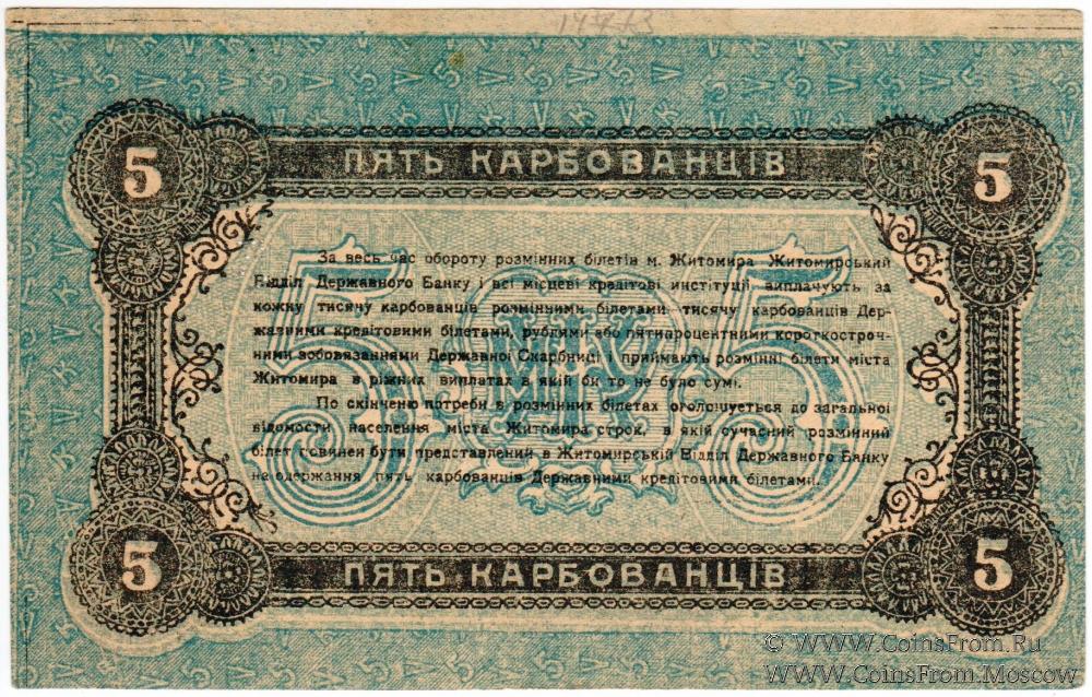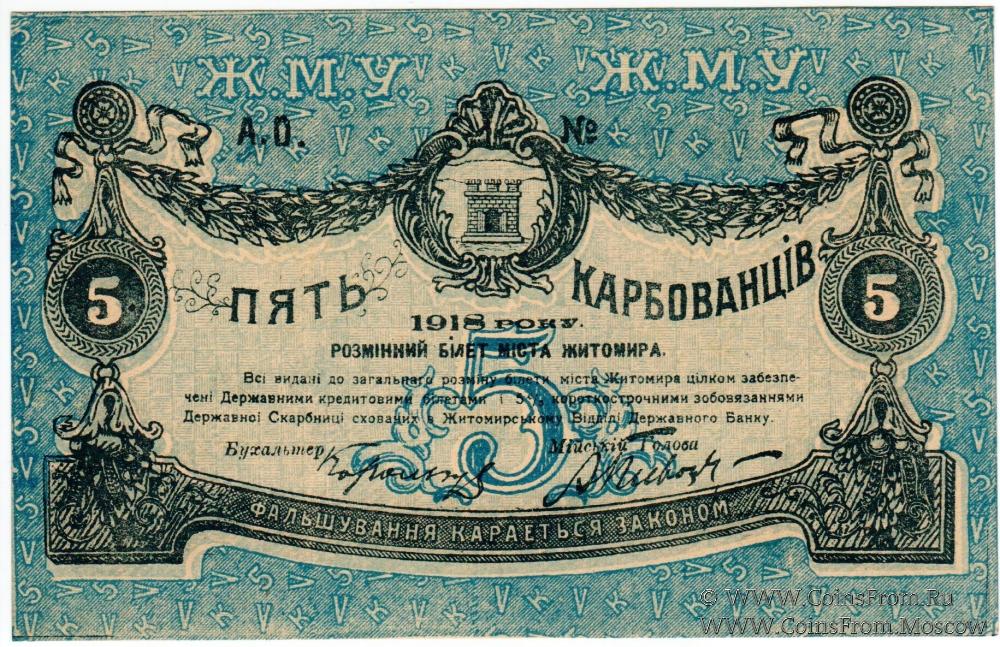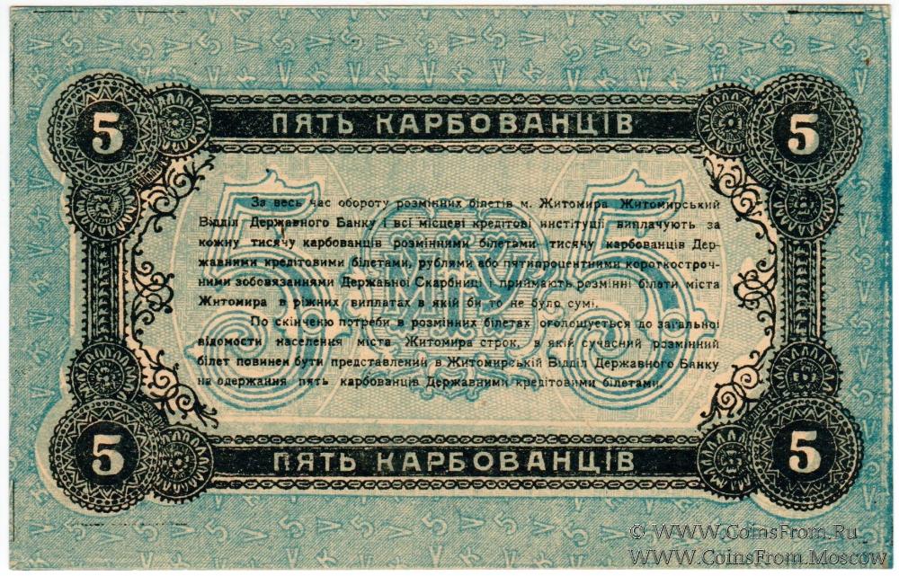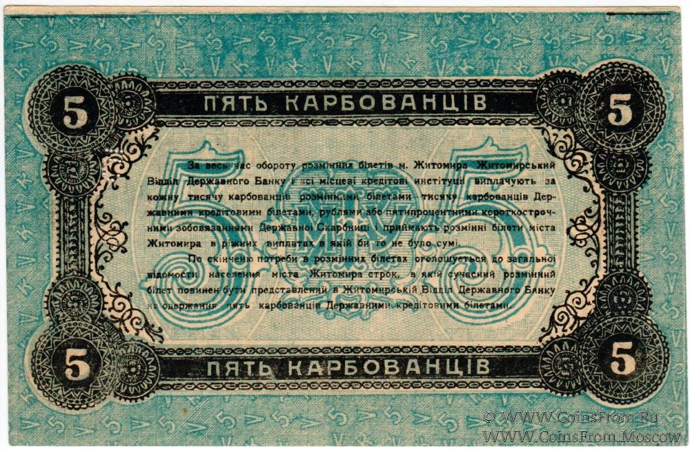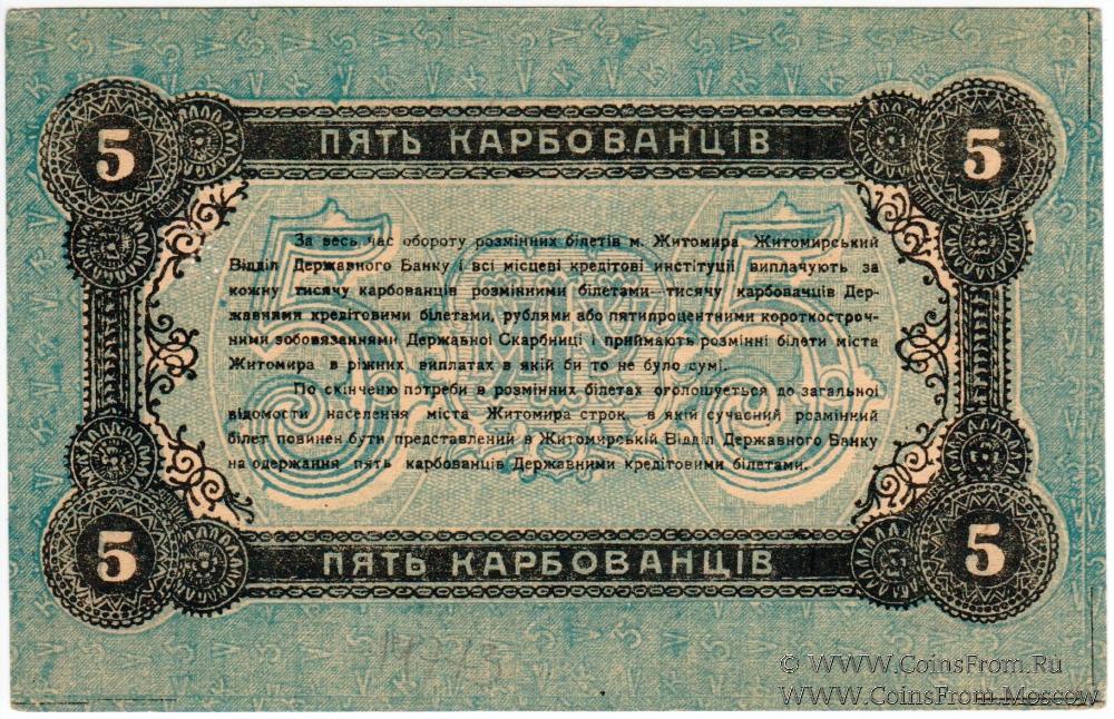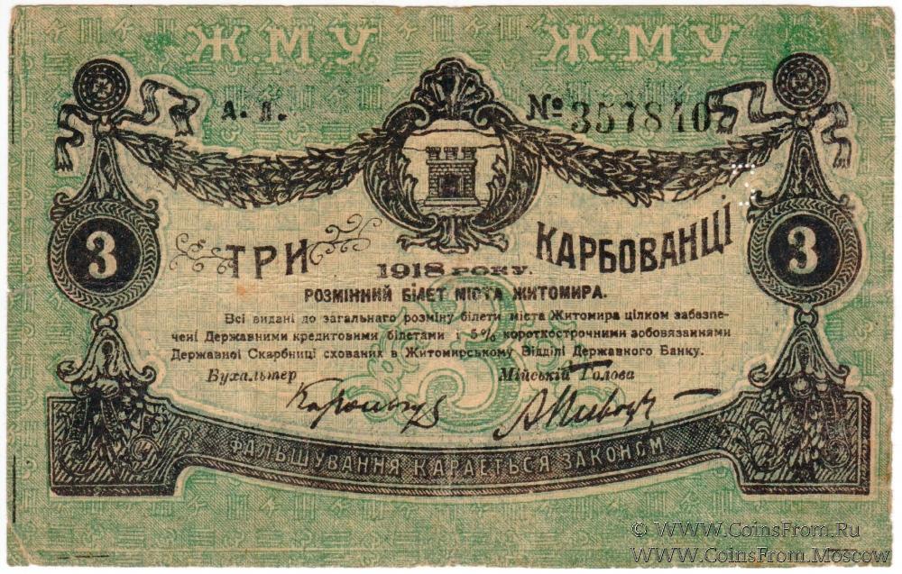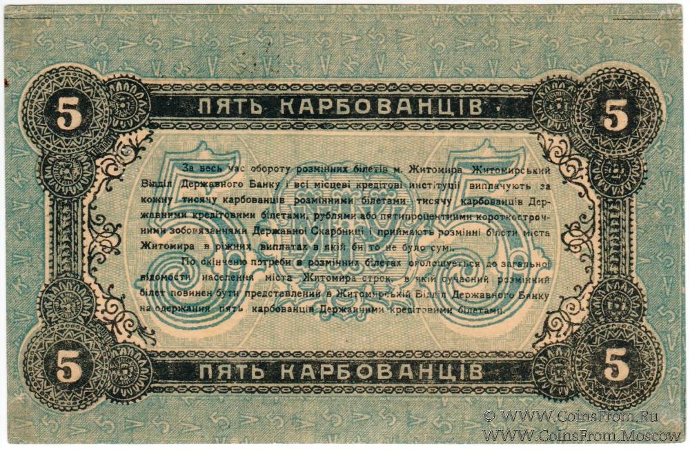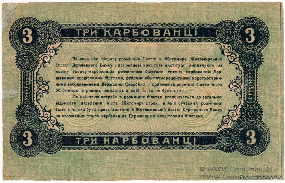 Житомир — губернский город Волынской губернии. Городское самоуправление. Розмiнний бiлет 1918 г. выпускался номиналом: 1 карбованец, 3 карбованца, 5 карбованцев.