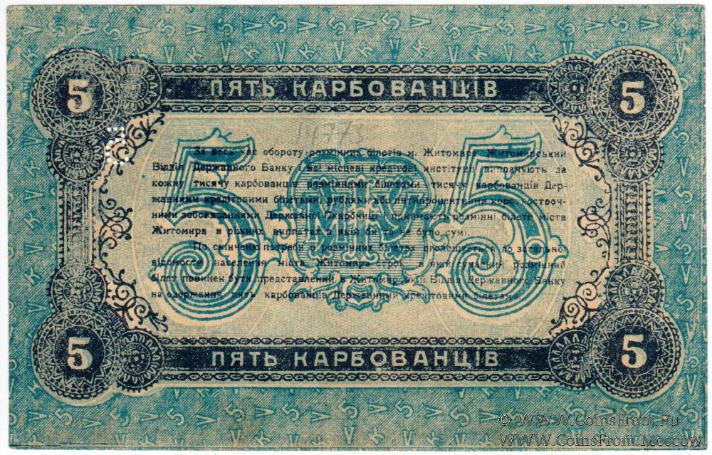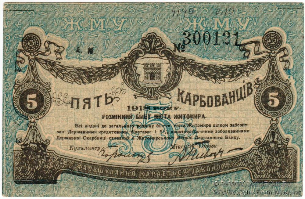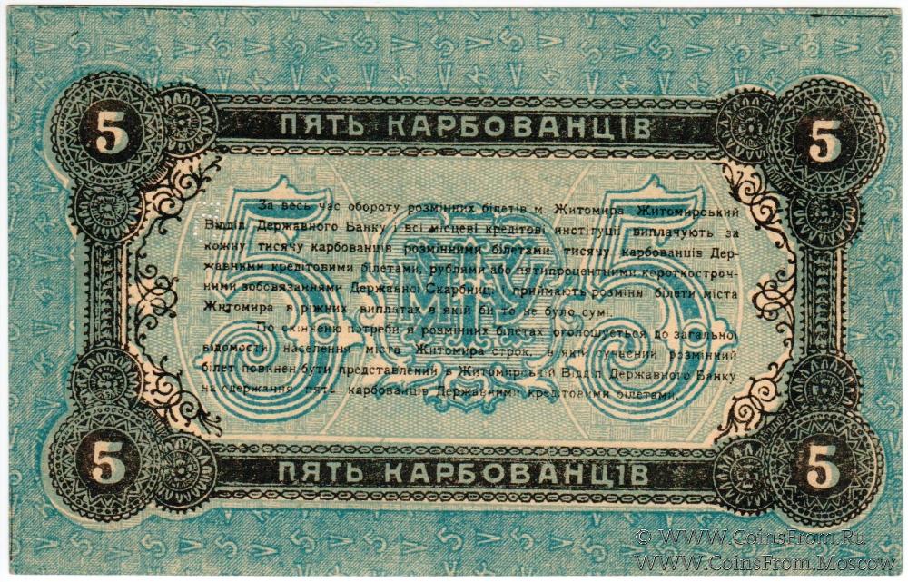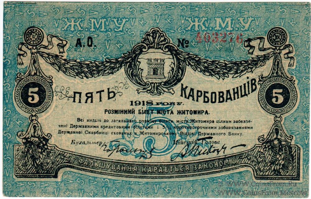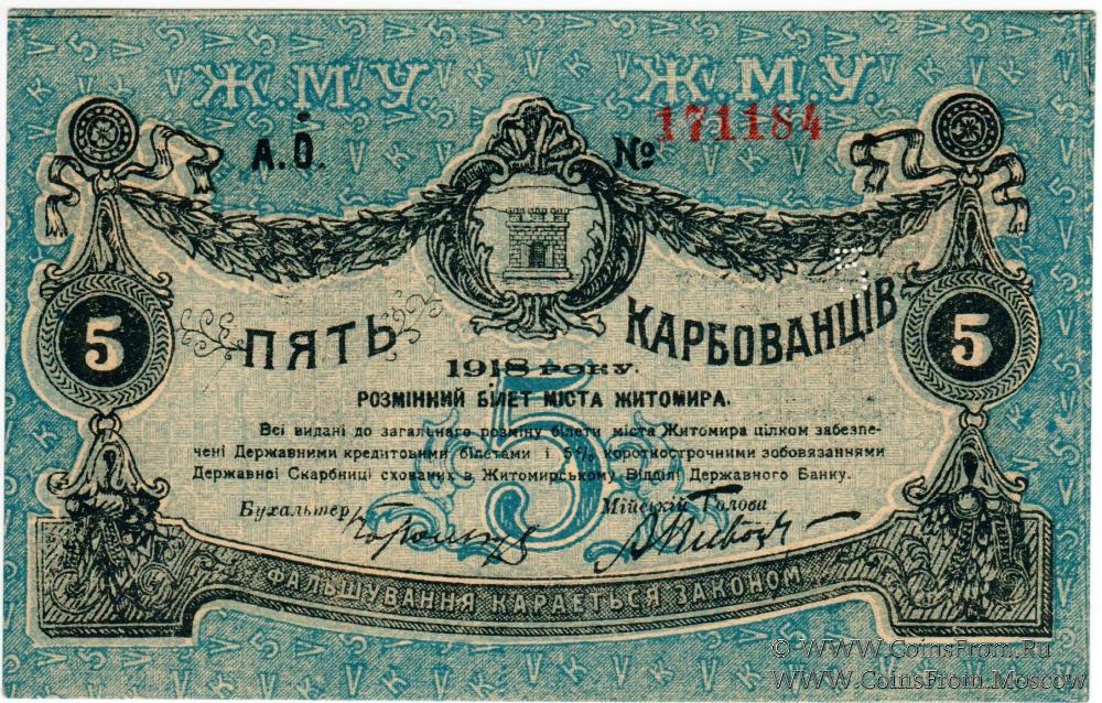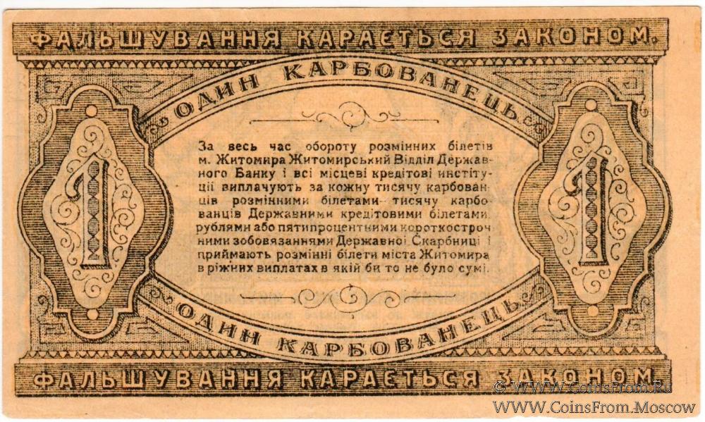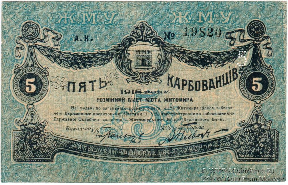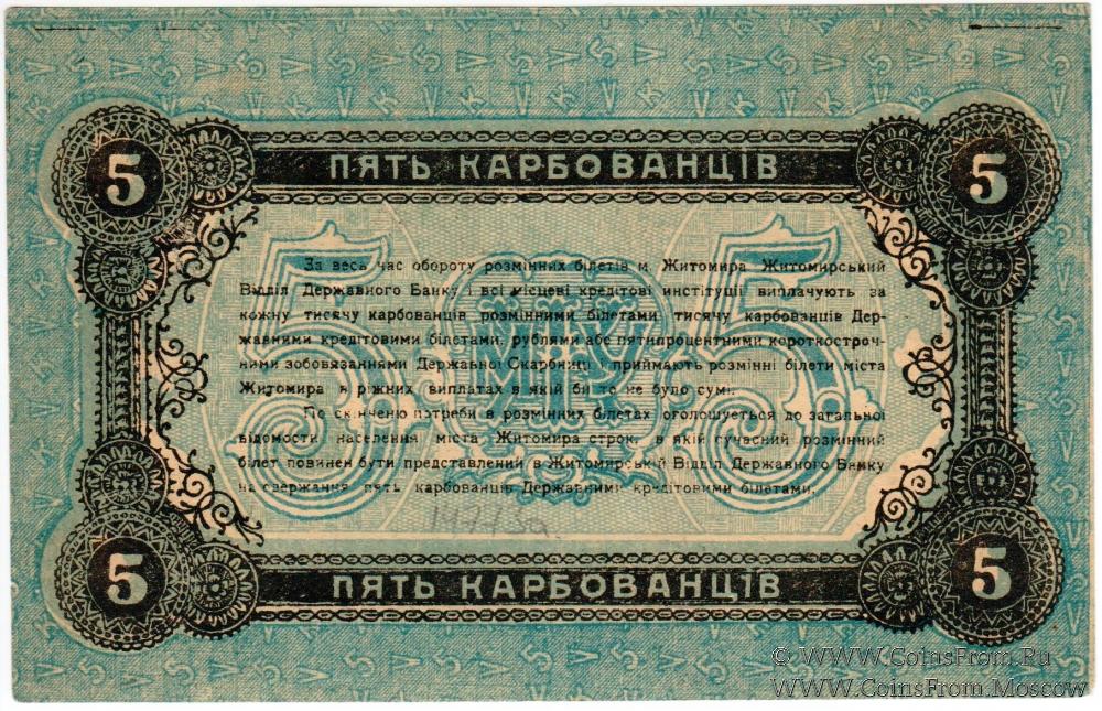 Житомир — губернский город Волынской губернии. Городское самоуправление. Розмiнний бiлет 1918 г. выпускался номиналом: 1 карбованец, 3 карбованца, 5 карбованцев.