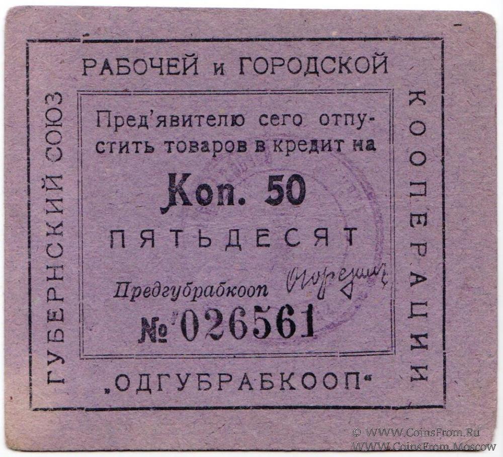 Печать на аверсе "Одесский Ц.Р.К.". Одесский Губернский Союз Рабочей и Городской Кооперации "ОДГУБРАБКООП"