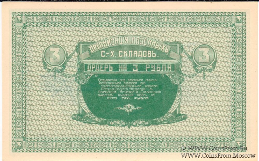 В Никольск-Уссурийске Организация казенных сельскохозяйственных складов выпустила свои ордера достоинством в 1, 3, 5, 10, 20, 40 и 100 руб.. на которых указывалось, что «предъявителю сего казенными сельскохозяйственными складами или товаро-продовольственными лавками переселенческого управления в Приморской, Амурской и Сахалинской областях выдается товар на такую-то сумму».