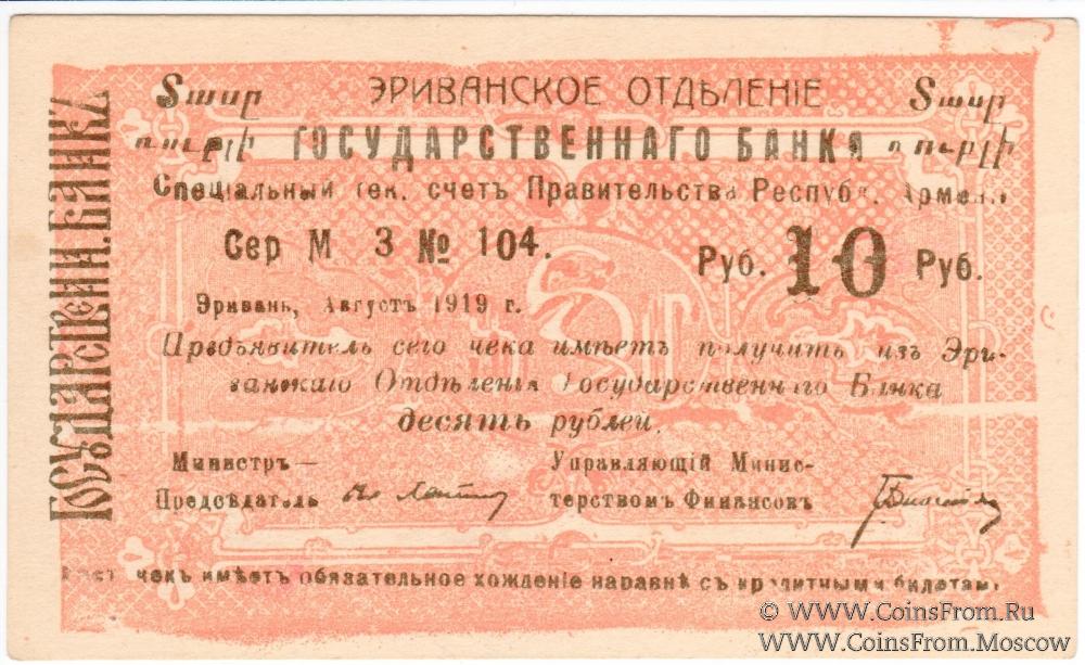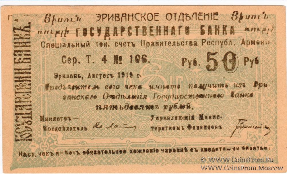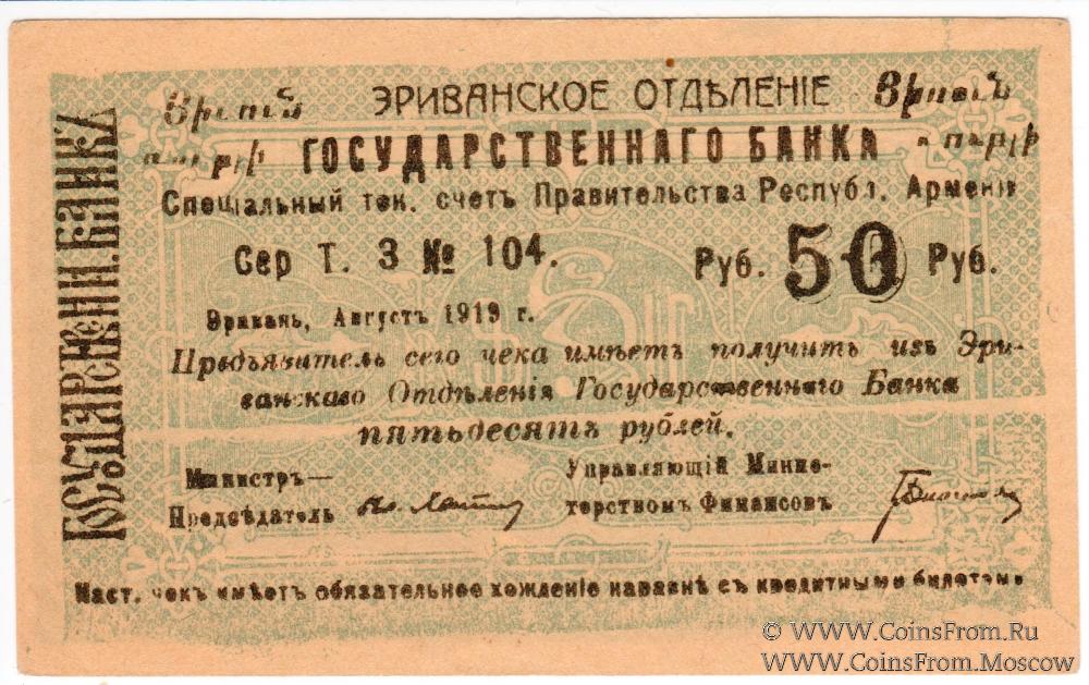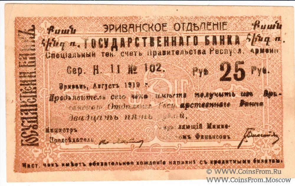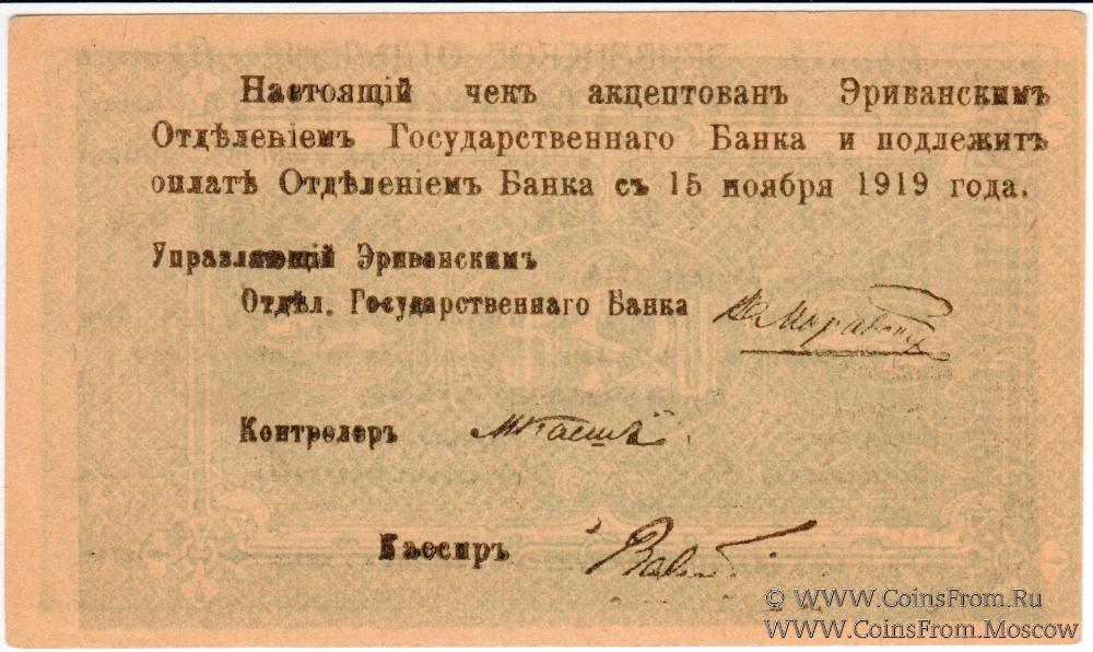 Демократическая республика Армения (Հայաստանի Դեմոկրատական Հանրապետություն). Комплект чеков Эриванского Отделения Государственного Банка. Август 1919 г. Срок 15.11.1919 г. Большой формы. Цифры номинала украшенные. Чеки: 5 рублей (серия И, двусторонний, без армянского текста на аверсе); 10 рублей (серия З, двусторонний, без армянского текста на аверсе); 10 рублей (серия М, односторонний; с армянским текстом на аверсе); 25 рублей (серия Н, односторонний; с армянским текстом на аверсе); 50 рублей (серия Т; двусторонний; с армянским текстом на аверсе); 50 рублей (серия Т; двусторонний; с армянским текстом на аверсе); 100 рублей (серия С; двусторонний; с армянским текстом на аверсе).
