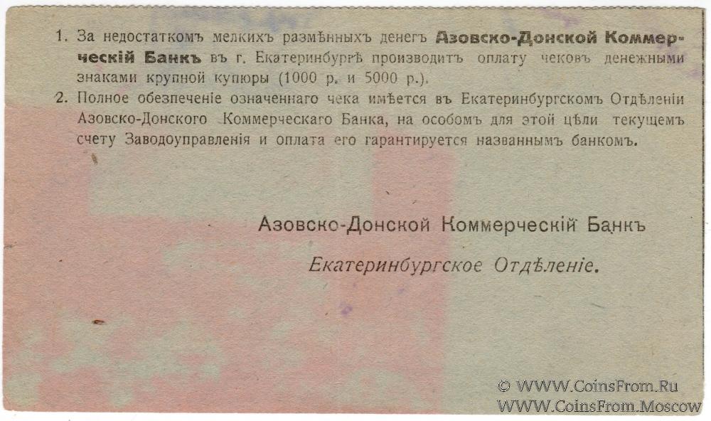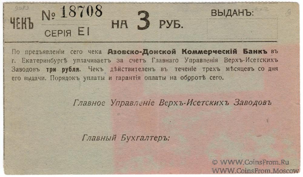 Чек без даты (1918-1919 гг.). Бланк с номером. Серия EI. Азовско-Донской Коммерческий Банк за счет Главного Управления Верх-Исетских заводов.