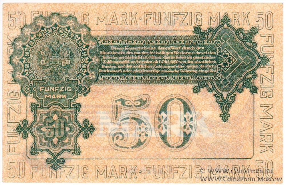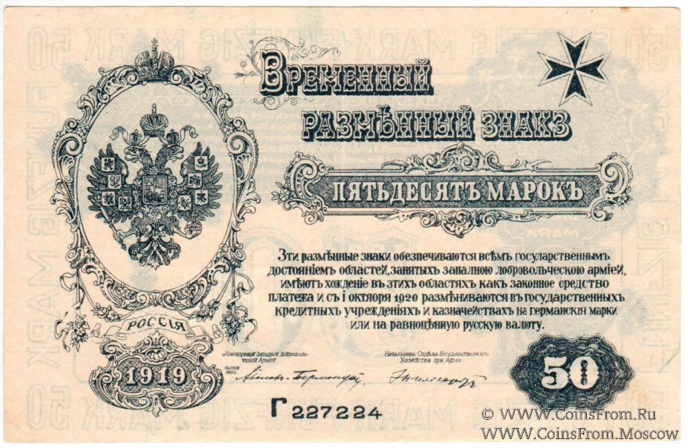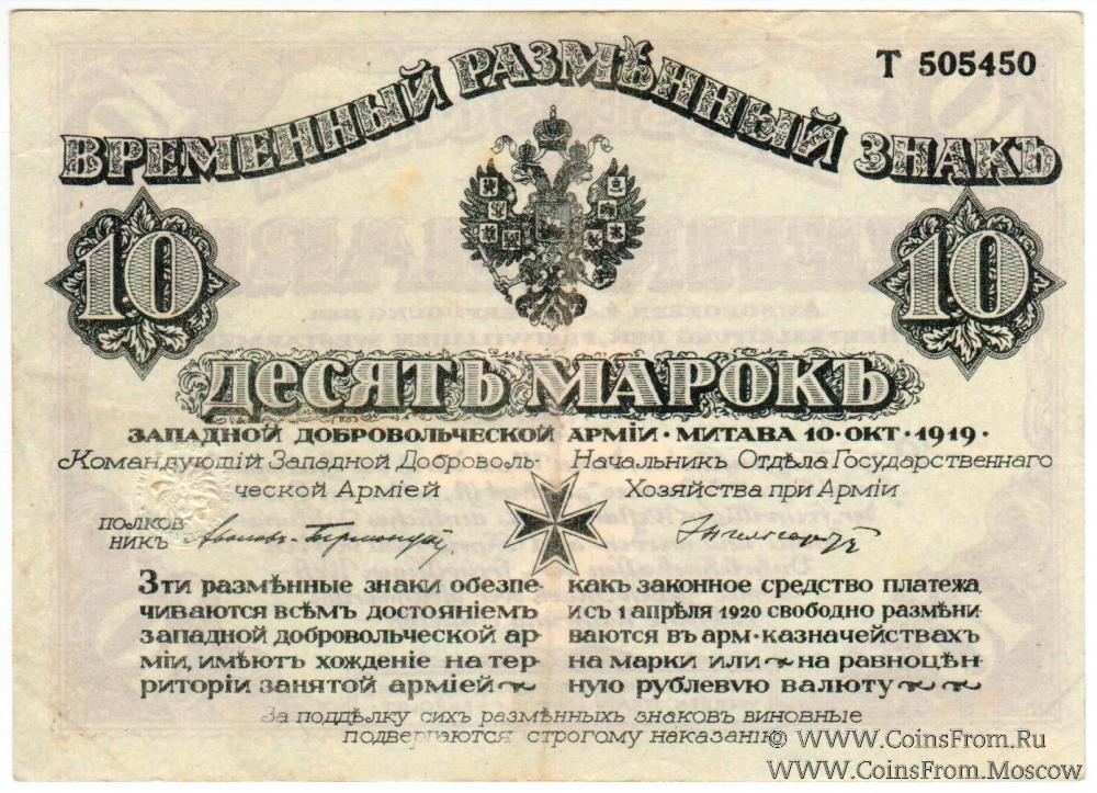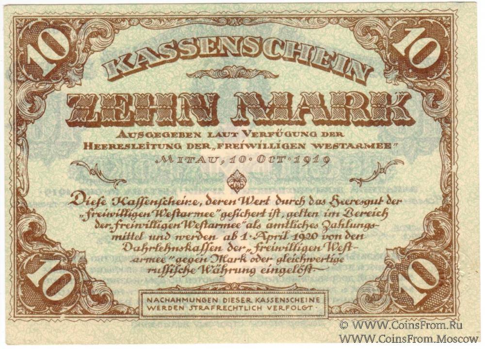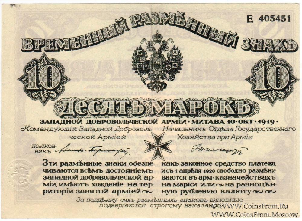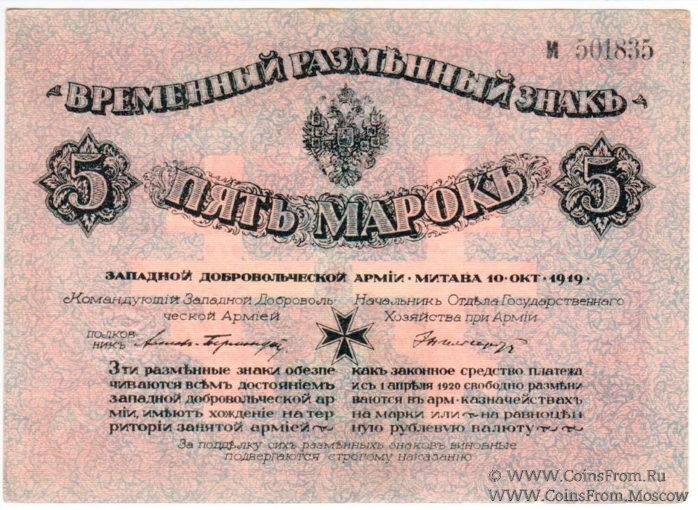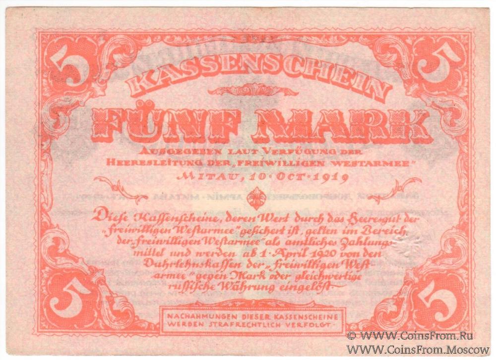 Западная Добровольческая Армия (Freiwilligen Westarmee). Полковник Авалов-Бермондт. Митава. Прибалтийский край. Комплект Временных разменных знаков (Kassenshein) 1919 г., с тиснением, номиналы: 1 марка (В 352646), 5 марок (И 501836), 10 марок (Е 405451), 10 марок (Т 505450), 50 марок (Г 227224).