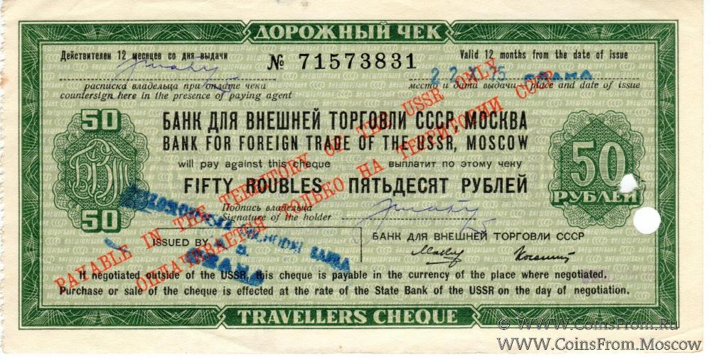 Дорожный чек. Выпуск без даты (1970 г.). Выдан: 1975 г. Погашен. Подписи: Макеев/Калашин. Банк для Внешней Торговли СССР, Москва.