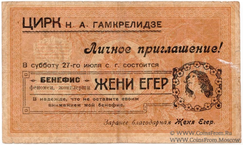 Государственный кредитный билет 1 рубль образца 1898 г. Модификация 1915 (с упрощенной нумерацией). Надпечатка приглашения на бенефис Жени Егер в цирке Н.А. Гамкрелидзе.