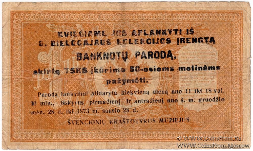 Государственный кредитный билет 1 рубль образца 1898 г. Модификация 1915 (с упрощенной нумерацией). Надпечатка пригласительного на выставку банкнот из коллекции G. Bielogajaus.