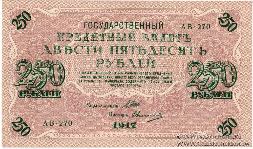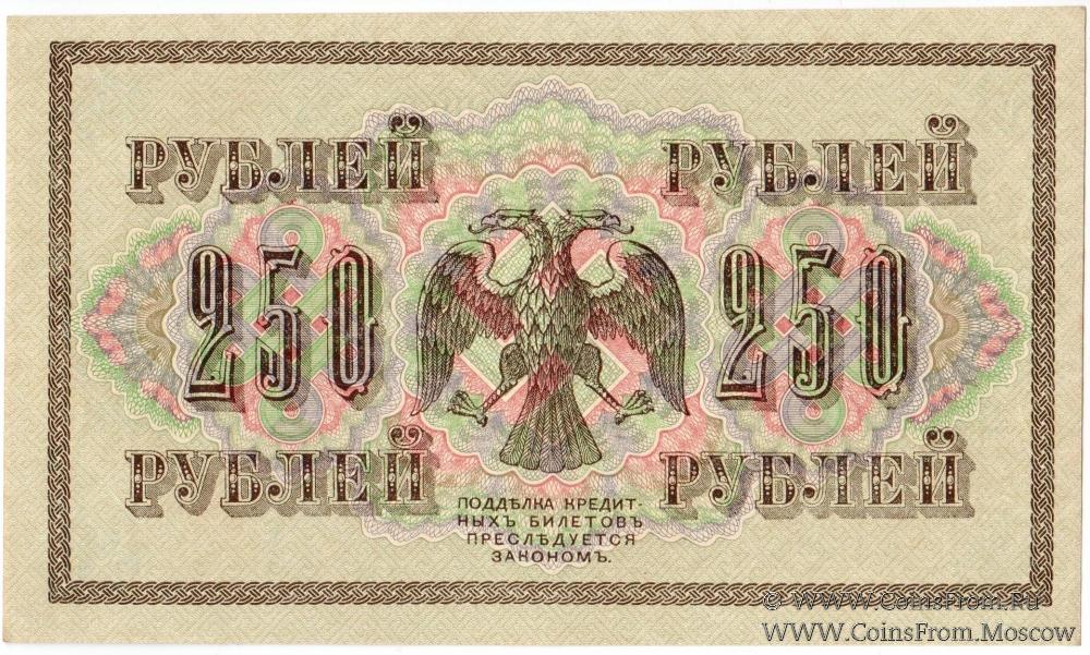 Государственные кредитные билеты образца 1917 г. Выпущены постановлениям Временного правительства от 26 апреля и от 22 aвгycтa 1917 года. На них был помешен новый государственный герб России. В орнаменте билетов использовалась свастика. Нумерация билетов 250 рублей трехзначная серийная. Серии двухлитерные. Каждая серия с одним и тем же номером выпускалась тиражом в 1 миллион экземпляров. Находились в обращении до 1922 г.