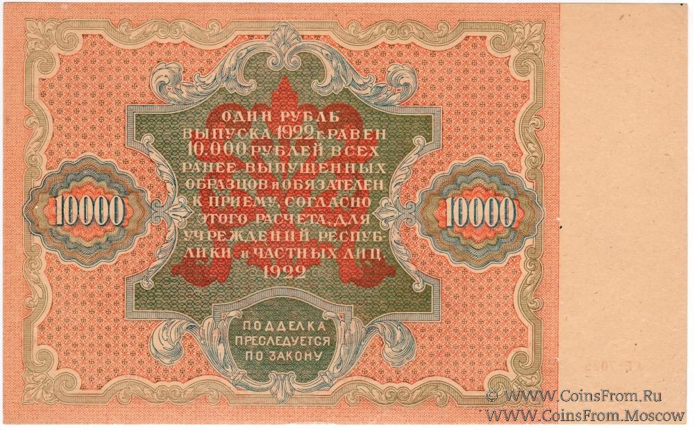 Первая деноминация. Государственные денежные знаки образца 1922г. выпущены на основание декрета СНК от 3 ноября 1921. 1 рубль 1922 приравнивался 10.000 рублей всех прежних выпусков. В обращении до 1 октября 1923 г.