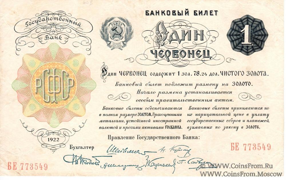 Банковые билеты Государственного Банка РСФСР выпущены на основании декрета СНК от 11 октября 1922 г. 1 червонец = 1 золотнику 78,24 долей чистого золота. Билеты образца 1922 года оставались в обращении до денежной реформы 1947 года.