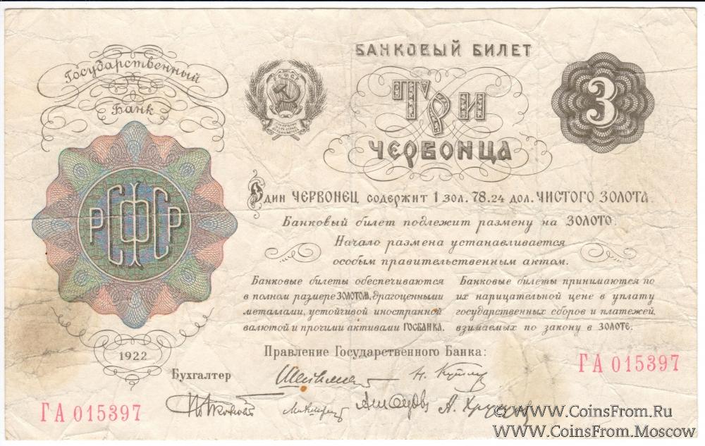 Государственные денежные знаки в золотой валюте. Банковый билет 3 червонца образца 1922 г. 6 подписей - Члены правления: А. Л. Шейнман, Н. Н. Кутлер, М. Е. Шефлер, А. И. Щвецов, А. Г. Хрущев и бухгалтер: П. Яконовский.