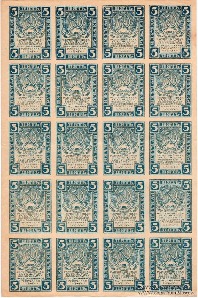 Полные листы: 1 рубль (1-й выпуск 1919 г.; 5х5), 3 рубля (1-й выпуск 1919 г.; 5х5) и 5 рублей (образца 1920 г.; 5х4).