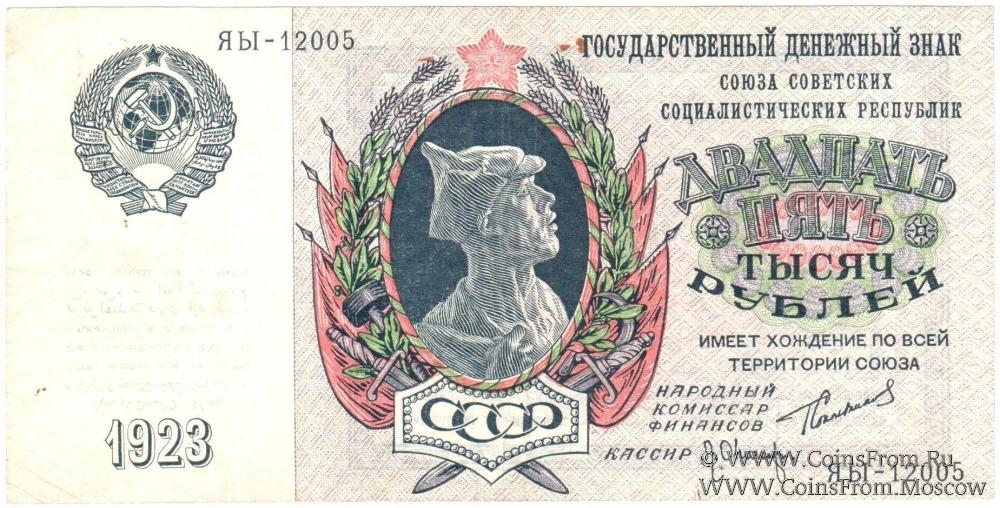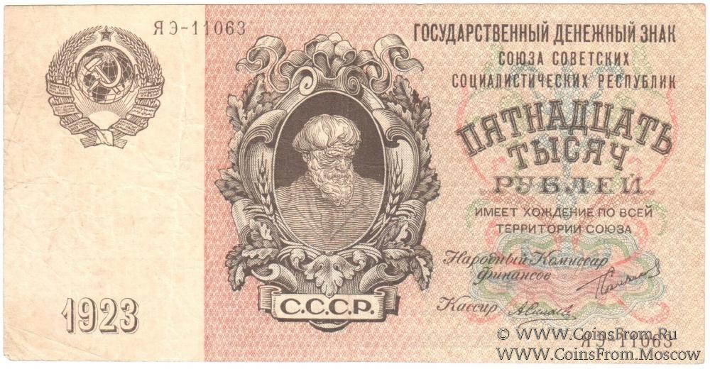 Государственные денежные знаки СССР 1923г. выпущены в обращение в 1923 - 1924 г. Постановлением СНК СССР от 14 февраля 1924 г. установлен твердый курс обмена советских денежных знаков номинированных не в золотой валюте - 1 к 50.000р. Обмен был завершен 31 июля 1924 г.