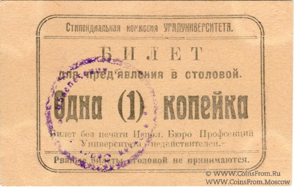 Екатеринбург (Свердловск с 1924 по 1991). Стипендиальная комиссия Уралуниверситета. Билет для предъявления в столовой. Размер ~9,2х5,8