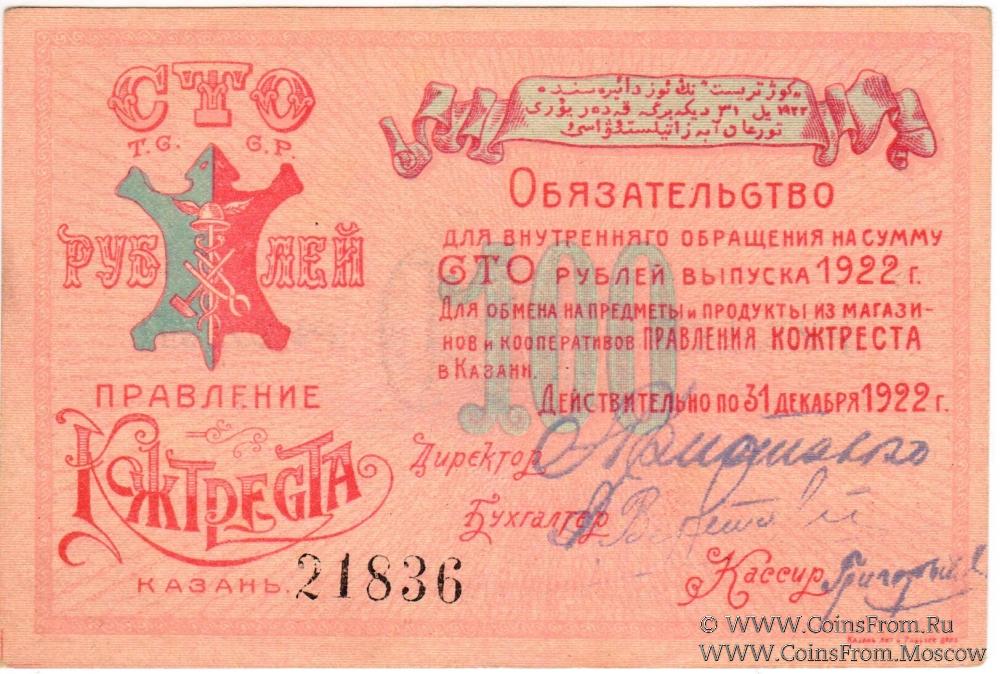 Правление Кожтреста. Полный комплект Обязательств для внутреннего обращения 1922г.: 10 рублей (№ 20338), 25 рублей (№ 10157), 50 рублей (№ 12622) и 100 рублей (№ 21836).