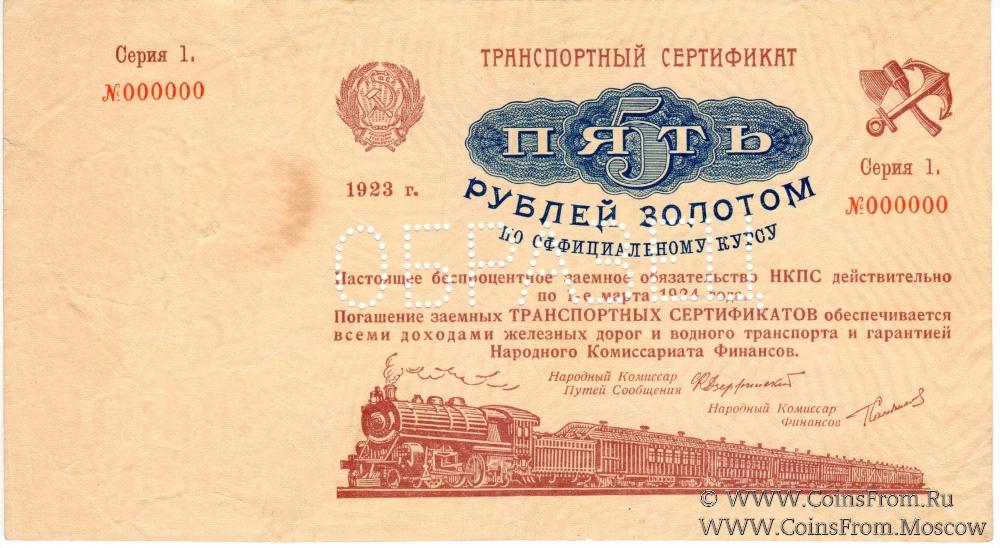 Транспортные Сертификаты НКПС выпускались на основании декрета СНК СССР от 26.7.1023 г. и постановлений СТО СССР от 23.11.1923 г., 8.12.1923 г., 26.3.1924 г. Последний срок обмена сертификатов на денежные знаки СССР - июль 1924 г.