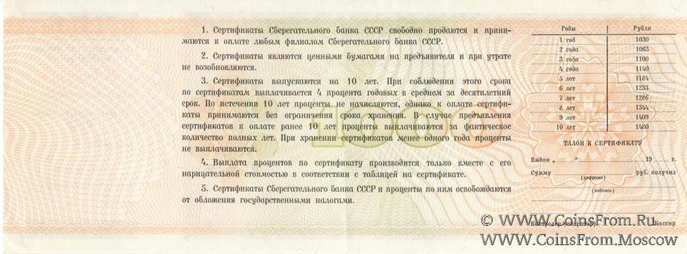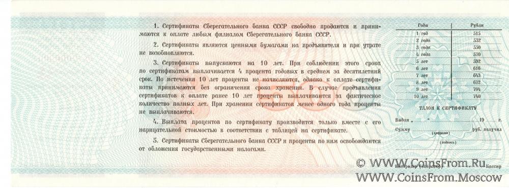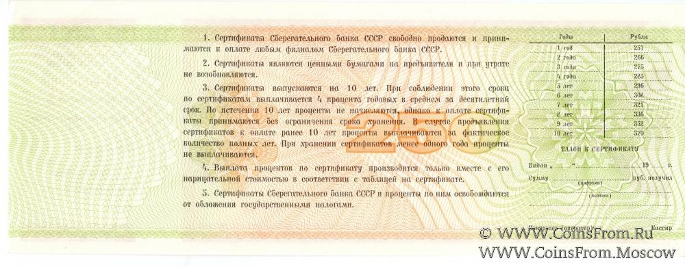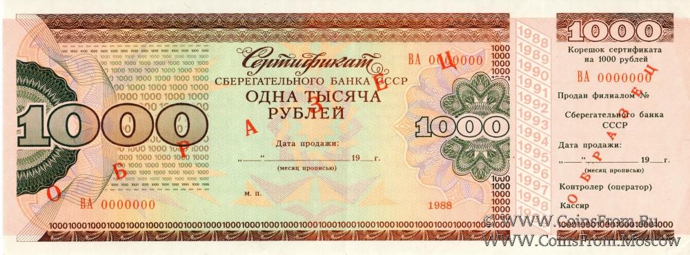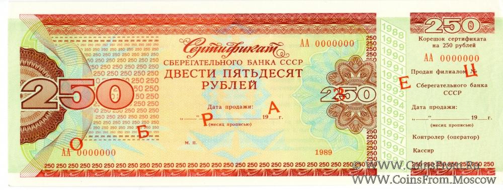 Сертификат 250 рублей 1989 года (ОБРАЗЕЦ). Сертификат 500 рублей 1989 года (ОБРАЗЕЦ). Сертификат 1000 рублей 1988 года (ОБРАЗЕЦ).