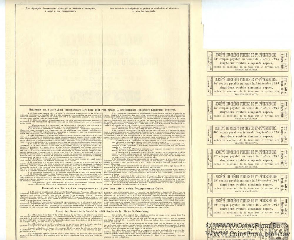 Облигация Санкт-Петербургского Городского Кредитного Общества 1908 г. Первой серии в 1000 рублей. Приносящая 4,5% дохода в год, уплачиваемых пополугодно: 1 марта и 1 сентября с удержанием сбора с доходов от денежных капиталов. 8 купонов.