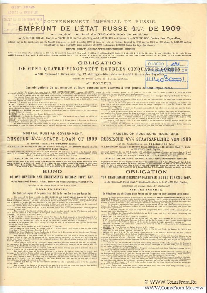 Российский государственный 4,5% заём 1909 года – внешний заём Российский империи, облигации которого освобождались от всех видов русских налогов. Облигации выпускались с купонным листом на 10 лет (20 купонов). По облигациям - именным или на предъявителя - предусматривалось 2 купона в год — со 2 января и с 1 июля, проценты начислялись со 2 января 1909 года. До 2 января 1919 года не предусматривалось выкупа или конверсии облигаций займа. Заем аннулирован с 1 декабря 1917 года декретом от 21 января 1918 года.