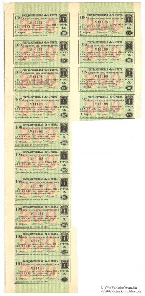 Указом от 6 марта 1898 года12 было разрешено принимать купоны от свидетельств ренты и вышедшие в тираж свидетельства в уплату таможенных пошлин, считая 1 рубль в этих купонах и свидетельствах равным 1/15 империала, и производить оплату купонов и тиражных свидетельств за границей. Курс оплаты составлял: 100 рублей = 266,67 франкам = 216 имперским германским маркам = 10 фунтам стерлингов 11 шиллингам 5 пенсам = 128 голландским гульденам.В 1913-1914 годах был произведен генеральный обмен всех выпущенных свидетельств Государственной 4 % ренты серий 1-270 на свидетельства нового типа (узкий лист) со сроком последнего купона 1 декабря 1924 года. Таким образом, фактически была произведена унификация свидетельств Государственной 4 % ренты.