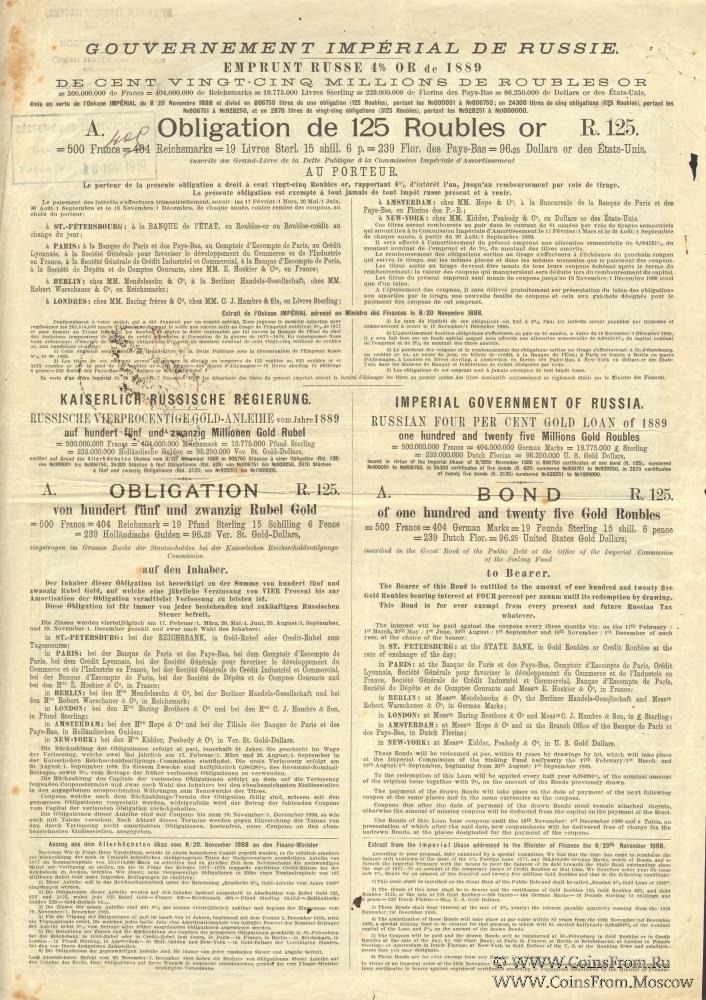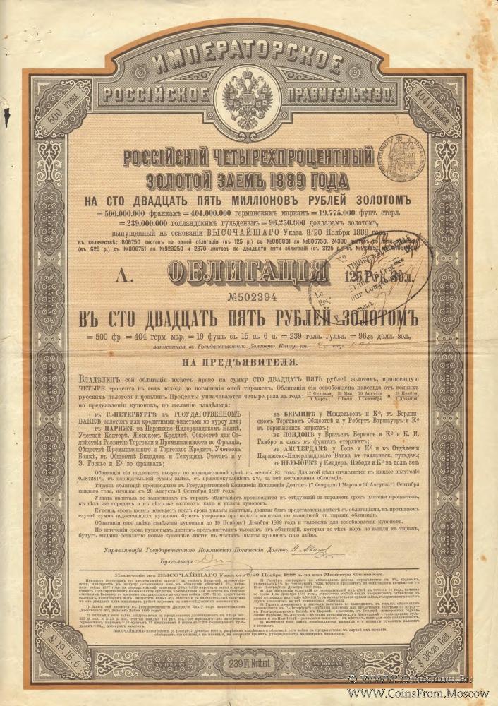 В 1889-1896 гг. Российское правительство выпустило Российский 4% золотой заем на сумму 332,0 млн. золотых рублей. Заем был совершен путем первого(1889 г.), второго (1890 г.), третьего (1890 г.), четвертого (1890 г.), пятого (1893 г.) и шестого (1894 г.) выпусков. Кроме того, правительство выпустило Российские 31/2 % и 3 % золотые займы 1894 г. и 1891 – 1896 гг. Облигации имели необычные номиналы: 125, 625, 3125 рублей золотом, 187 рублей 50 копеек и 937 рублей 50 копеек. Это было сделано для удобства перевода в европейские валюты по фиксированному курсу, прежде всего французского рынка, так как Франция являлась главным кредитором России.