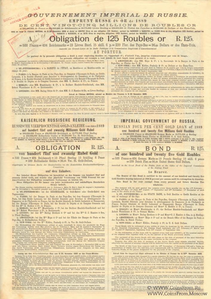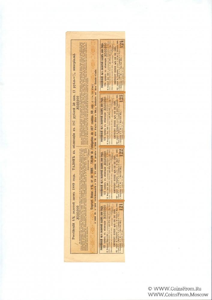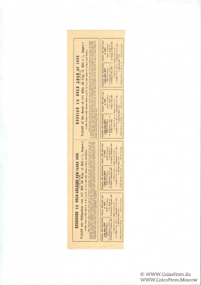 В 1889-1896 гг. Российское правительство выпустило Российский 4% золотой заем на сумму 332,0 млн. золотых рублей. Заем был совершен путем первого(1889 г.), второго (1890 г.), третьего (1890 г.), четвертого (1890 г.), пятого (1893 г.) и шестого (1894 г.) выпусков. Кроме того, правительство выпустило Российские 31/2 % и 3 % золотые займы 1894 г. и 1891 – 1896 гг. Облигации имели необычные номиналы: 125, 625, 3125 рублей золотом, 187 рублей 50 копеек и 937 рублей 50 копеек. Это было сделано для удобства перевода в европейские валюты по фиксированному курсу, прежде всего французского рынка, так как Франция являлась главным кредитором России.