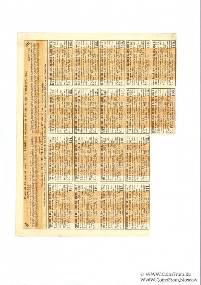 Заем был заключен согласно указу от 17 сентября 1891 года (№ 7980) через посредство синдиката иностранных и русских банкиров на сумму 125 миллионов рублей золотом. Средства, полученные от займа, использовались на железнодорожное строительство. Погашение займа предусматривалось в течение 81 года. Облигации выпускались с 1891 года с купонным листом на 10 лет (40 купонов). По облигациям предусматривалось четыре купона в год — с 19 марта, с 18 июня, с 19 сентября и с 19 декабря. Течение процентов, начиная с 19 сентября 1891 года. Облигации займа выпускались как именные, так и на предъявителя. В связи с завершением денежной реформы Витте 1895-1898 годов 1 рубль золотом по закону от 17 декабря 1885 года (=1/10 империала) стал приравниваться 1,5 рублям (1 рубль=1/15 империала) согласно закону от 7 июня 1899 года. Облигация в 125 рублей золотом стала стоить 187 рублей 50 копеек, облигация в 625 рублей стала стоить 937 рублей 50 копеек и облигация в 3 125 рублей золотом стала стоить 4 687 рублей 50 копеек. Заем был аннулирован с 1 декабря 1917 года декретом от 21 января 1918 года.