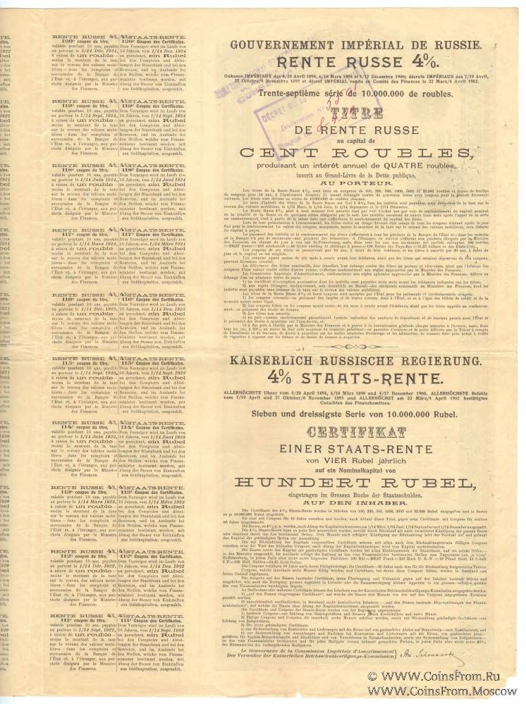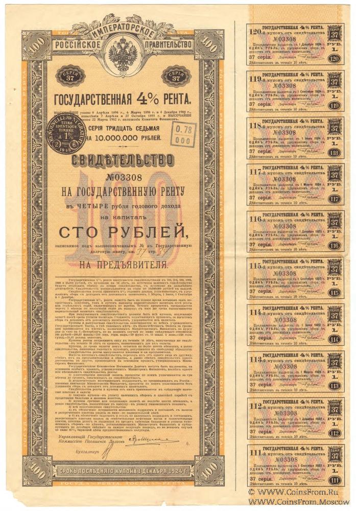 Указом от 6 марта 1898 года12 было разрешено принимать купоны от свидетельств рен­ты и вышедшие в тираж свидетельства в уплату таможенных пошлин, считая 1 рубль в этих купонах и свидетельствах равным 1/15 империала, и производить оплату купонов и тиражных свидетельств за границей. Курс оплаты составлял: 100 рублей = 266,67 франкам = 216 имперским германским маркам = 10 фунтам стерлингов 11 шиллингам 5 пенсам = 128 голландским гульденам.В 1913-1914 годах был произведен генеральный обмен всех выпущенных свидетельств Государственной 4 % ренты серий 1-270 на свидетельства нового типа (узкий лист) со сроком последнего купона 1 декабря 1924 года. Таким образом, фактически была произведена унификация свидетельств Государственной 4 % ренты.