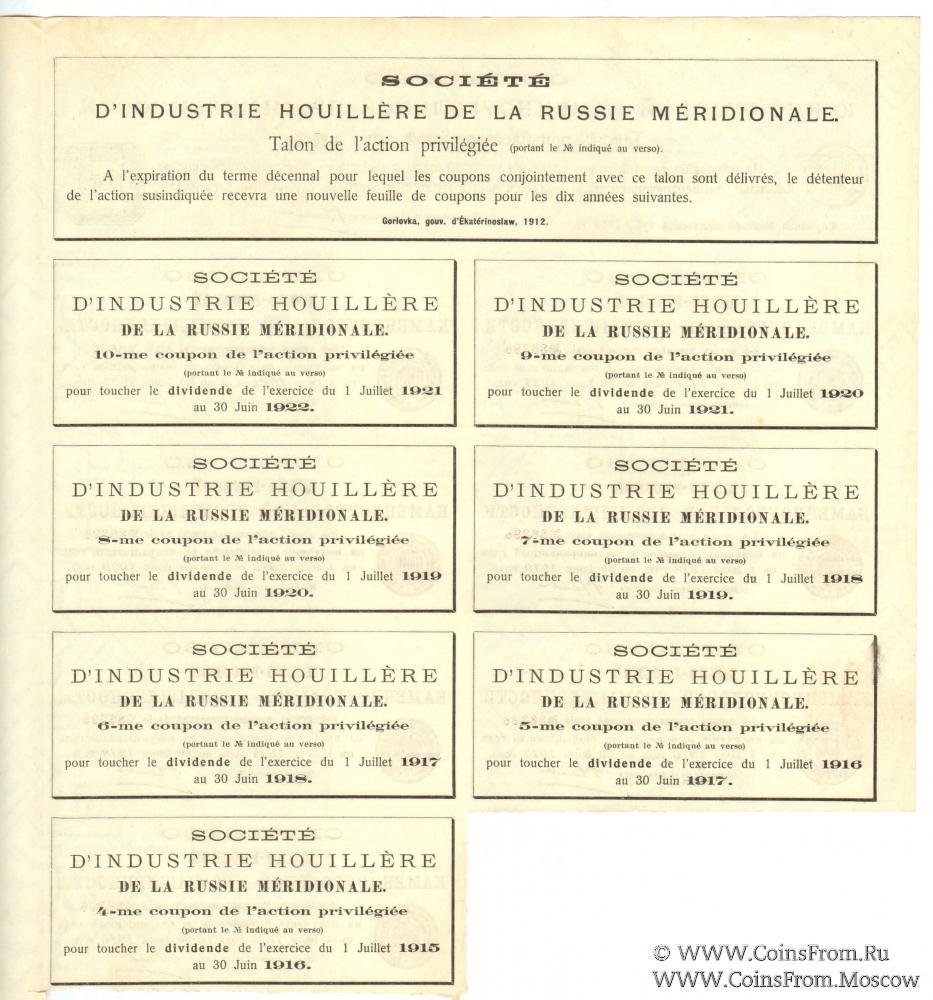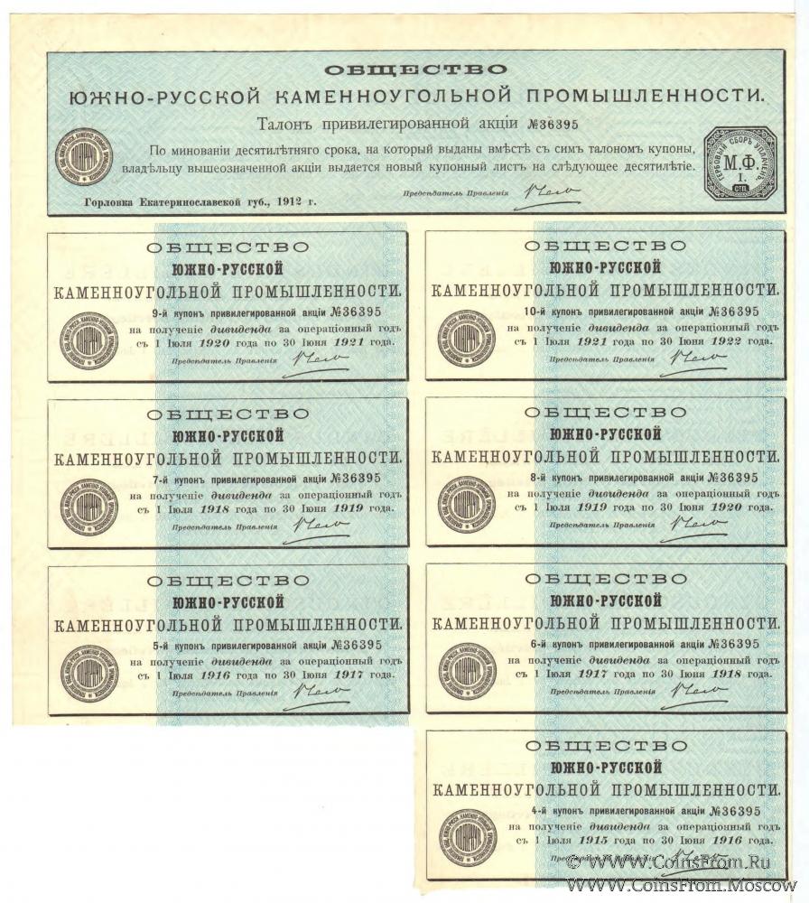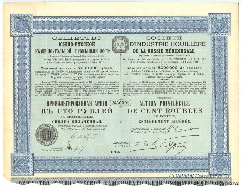 «Общество Южно-Русской каменноугольной промышленности» было образовано в апреле 1872 году с уставным капиталом 1,25 млн. рублей (25 000 акций по 50 руб.). Общество само по себе очень интересно, т.к. сыграло очень важную роль в становлении производственного потенциала Донбасса, это была первая угольная компания Центрального района Донбасса.Это крупнейшее акционерное общество, которое кроме добычи угля, выжига кокса и их оптового сбыта, добывало в Бахмутском уезде и сбывало железную руду, владело известковым и кирпичным заводами, участком железной дороги, лесным массивом на Кавказе. В середине 90-х годов XIX века оно занимало первое место среди угледобывающих предприятий Донбасса по количеству вагонов с углем и коксом, отправленных потребителям. За заслуги в развитии угольной промышленности Общество дважды награждалось Государственным гербом и дважды Золотыми медалями.