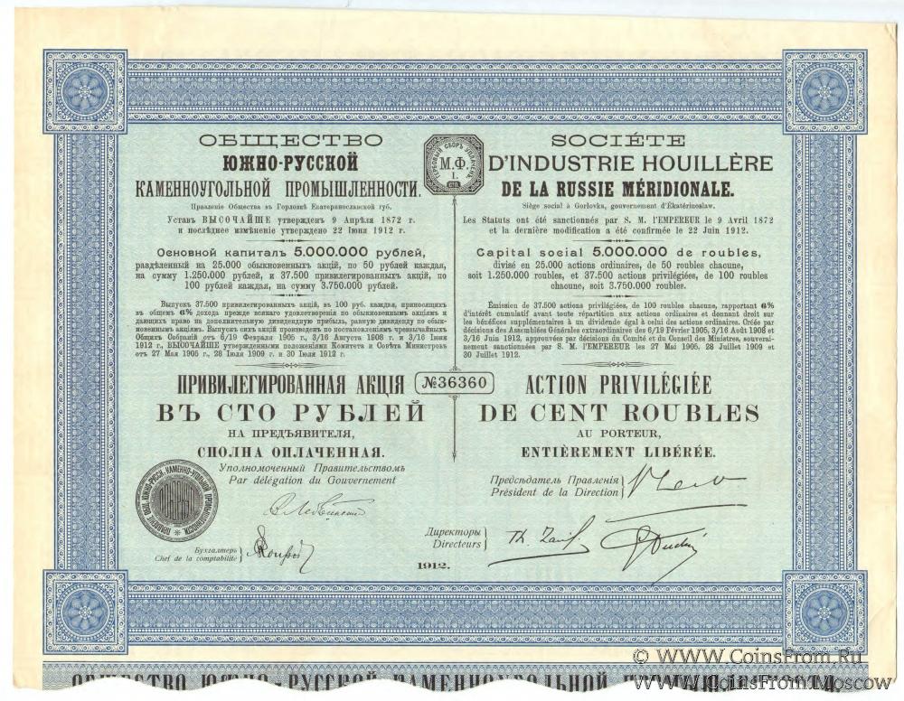 «Общество Южно-Русской каменноугольной промышленности» было образовано в апреле 1872 году с уставным капиталом 1,25 млн. рублей (25 000 акций по 50 руб.). Общество само по себе очень интересно, т.к. сыграло очень важную роль в становлении производственного потенциала Донбасса, это была первая угольная компания Центрального района Донбасса.Это крупнейшее акционерное общество, которое кроме добычи угля, выжига кокса и их оптового сбыта, добывало в Бахмутском уезде и сбывало железную руду, владело известковым и кирпичным заводами, участком железной дороги, лесным массивом на Кавказе. В середине 90-х годов XIX века оно занимало первое место среди угледобывающих предприятий Донбасса по количеству вагонов с углем и коксом, отправленных потребителям. За заслуги в развитии угольной промышленности Общество дважды награждалось Государственным гербом и дважды Золотыми медалями.
