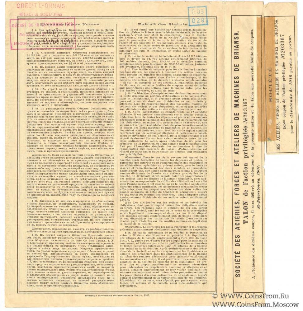 Акция в 100 рублей на предъявителя Общества Брянского рельсопрокатного, желе-зоделательного и механического завода, выпущенная в 1907 г. на нарицательный капитал 24 175 000 руб. Акция на русском и французском языках, на бумаге с во-дяными знаками (плетенка). Факсимиле подписей директоров, бухгалтера и кассира. На обороте французская печать розовыми чернилами от 1918 г. Рукописная дата 10 августа 1919 г.