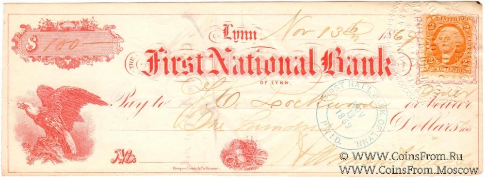 Банковский чек (оплачен, погашен). Круглая синяя печать банка. Первый Национальный банк Линна (The First National Bank of Linn).
