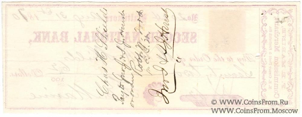 Банковский чек (оплачен). Второй национальный банк (Sekond National Bank). Baltimore. Ф. Э. Марин, комиссионер (F.E. MARINE, Commission Merchant).