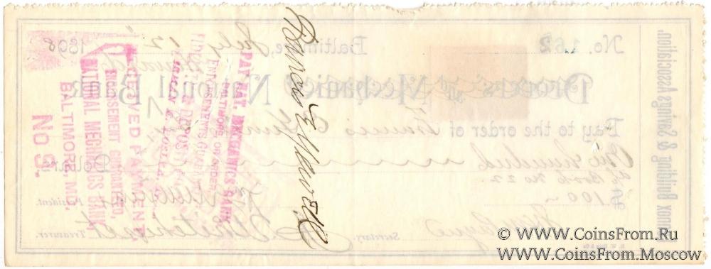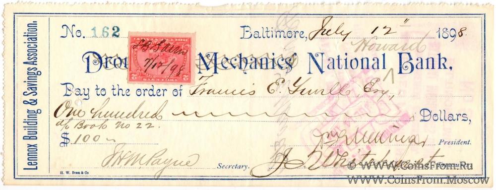 Банковский чек (оплаен). Drovers and Mechanics National Bank. Howard. Lennox Building & Savings Association.