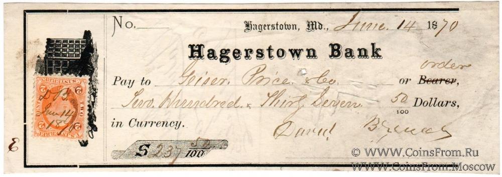 Банковский чек (погашен, оплачен). Перфорация. Штампы. Подписи. Хейгерстаун Банк (Hagerstown Bank).