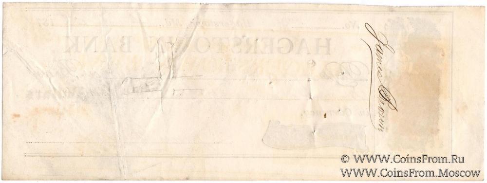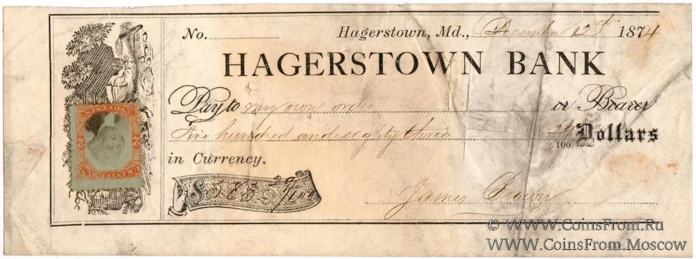Банковский чек (погашен, оплачен). Перфорация. Штампы. Подписи. Хейгерстаун Банк (Hagerstown Bank).