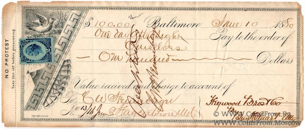 Банковский чек (оплачен, погашен). Реверс: штамп банка погашения Third National Bank of Baltimore.