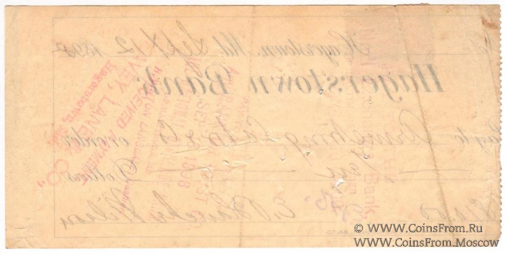 Банковский чек (погашен, оплачен). Перфорация. Штампы. Подписи. Хейгерстаун Банк (Hagerstown Bank). Типография: Paul & Falconer.