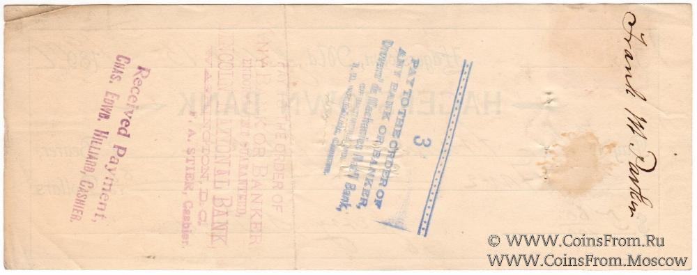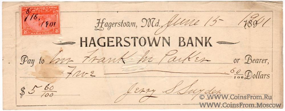 Банковский чек (погашен, оплачен). Перфорация. Штампы. Подписи. Хейгерстаун Банк (Hagerstown Bank).