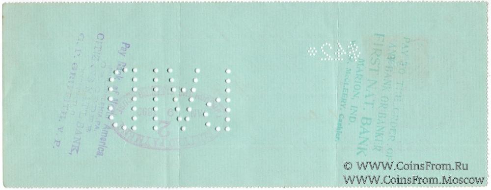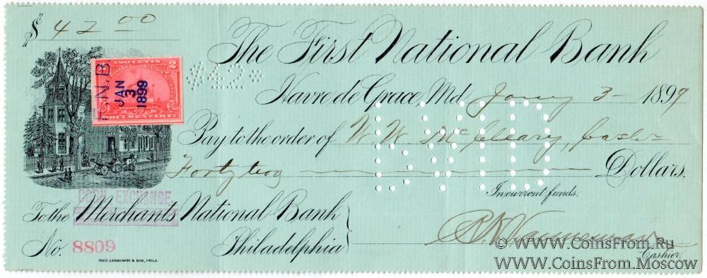Банковский чек № 8809 (оплачен, погашен). Перфорация "PAID" и "$42*". The First National Bank. Типография: Theo. Leonhardt & Son. Philadelphia.