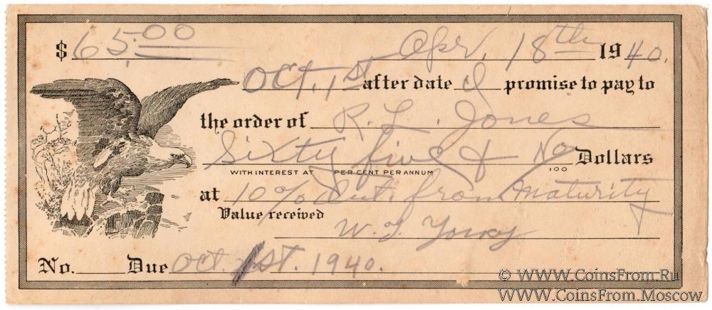 Банковский чек без номера, без даты (19__ г.). Бланк, не использовался. Заполнен карандашом.