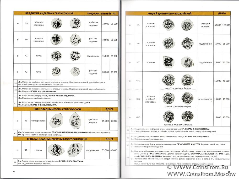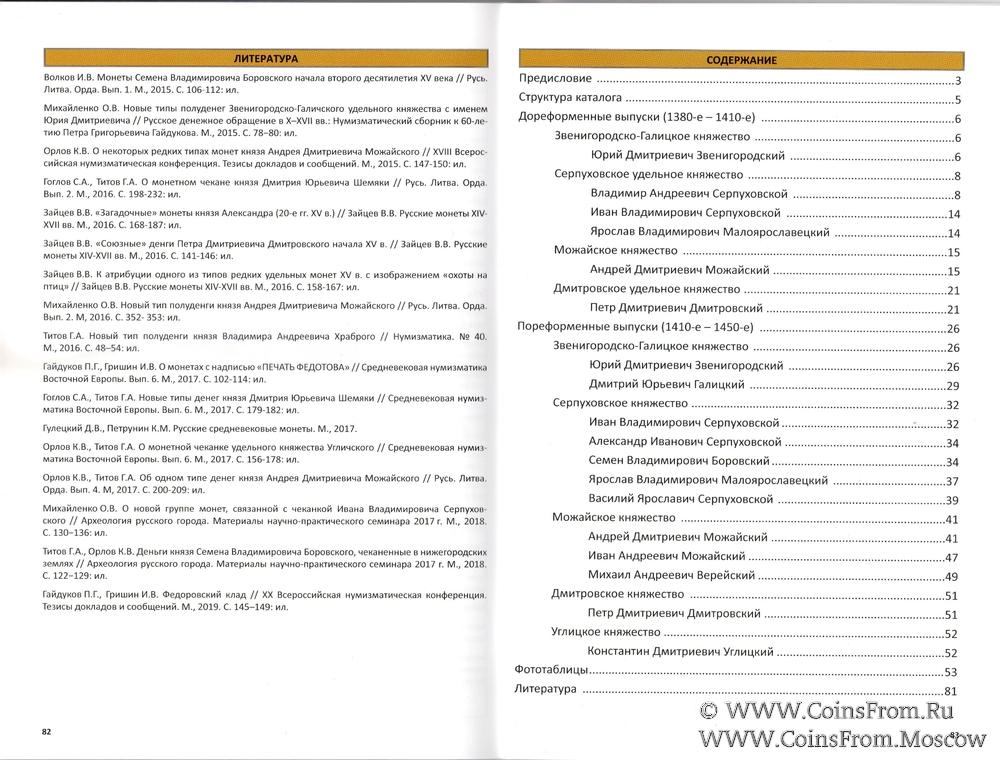 В книге представлены основные типы русских серебряных монет, выпущенных в 1380 - 1450-х годах московскими удельными князьями: звенигородскими, серпуховскими, можайскими, дмитровскими, углицкими, и другими. Для каждого типа выполнена прорисовка, дано краткое описание лицевой и оборотной сторон, приведены цены для разных состояний. Большинство типов представлено цветными фотографиями монет.